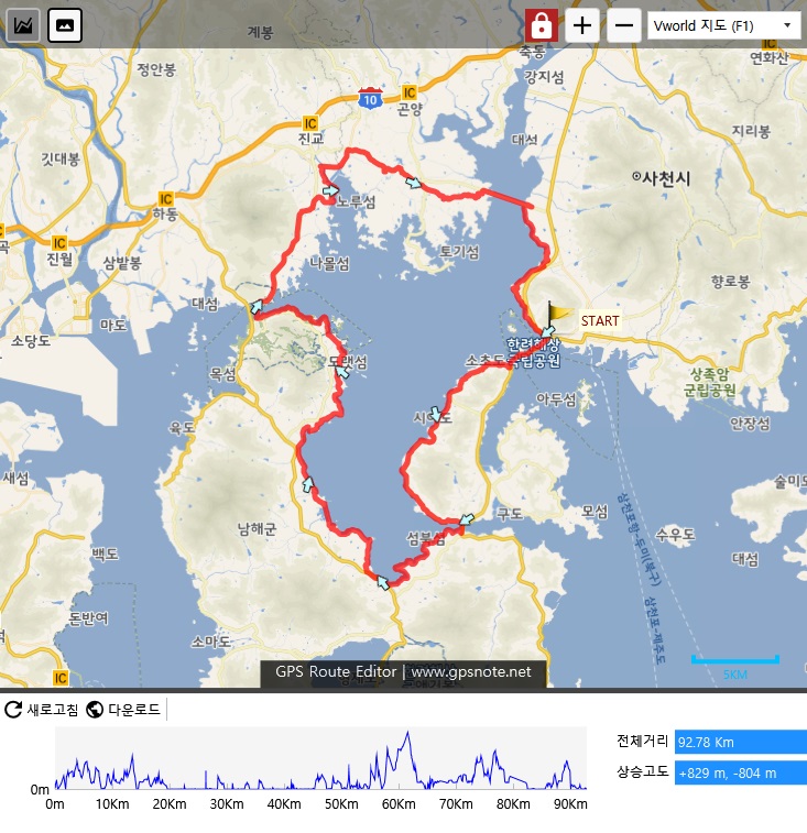 남해군을 안쪽으로 도는 자전거 코스이다. 자전거길 표시가 되어 있지만 자전거 전용 도로가 아니라 자전거길 표시가 되어 있을 뿐인 차도가 많다. 하지만, 차량 통행이 많지 않아서 자전거 타기에 아주 좋은 코스이다. 삼천포 대교공원이 출발지로 좋지만 순환형이라 어디에서 출발해도 좋다. 남해안의 리아스식 해안에 아주 근접하여 달리기 때문에 풍경이 매우 좋은 곳이다. 창선도의 1024번 지방도 구간은 차량 통행이 조금 많지만 다른 경로인 3번 국도를 대부분의 차량들이 이용하므로 3번국도로 가지 않도록 한다. 노량에서 사천대교까지는 일반도로를 달려야 하며 약간의 낙타등 구간이다.